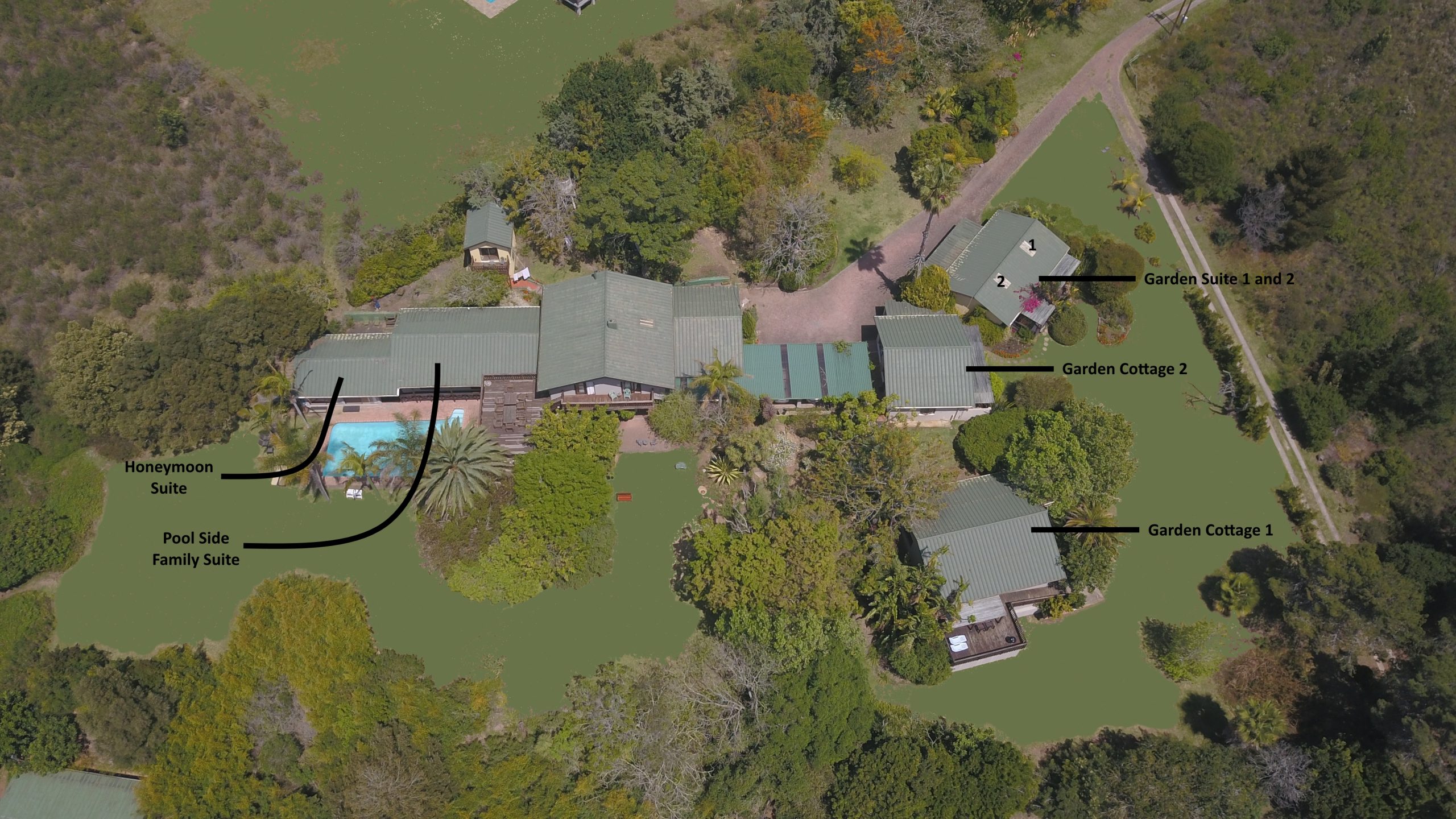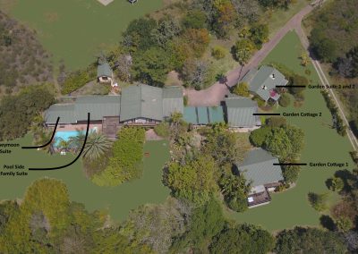 We have two Garden Suites – no 1 & no 2 catering for 2 people sharing. We also have a Couples Suite with a spa bath which can also accommodate 2 people. We have a Family Suite that has 2 bedrooms and 2 bathrooms and caters for 4 people sharing. The bed & breakfast accommodation does not allow for self catering. We do have two cottages that are self catering